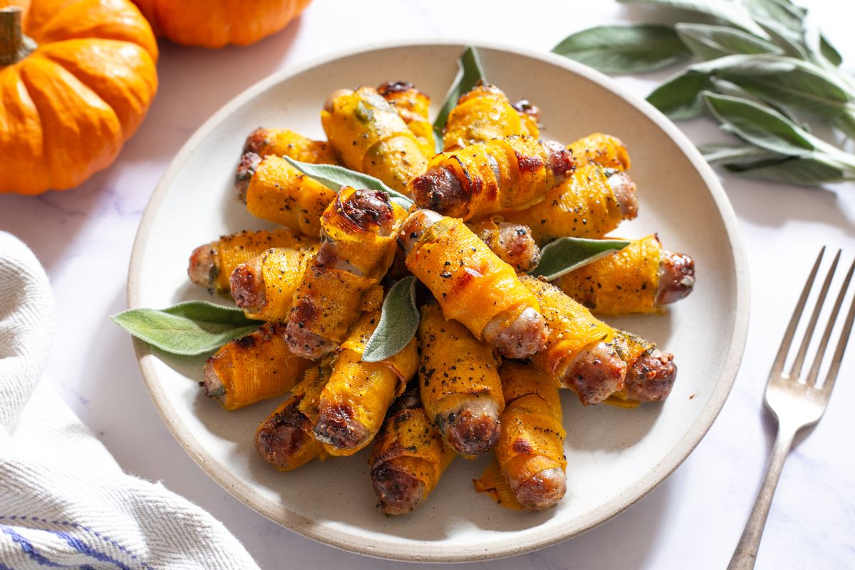These Keto/Low-Carb Fall appetizers are the perfect bite-sized snack for a family or friend's gathering. Sausages are marinated in sage and garlic before being wrapped in butternut squash ribbons and roasted in the oven. You can use chipolata sausages and cut them in half or any other sausage of your choice.