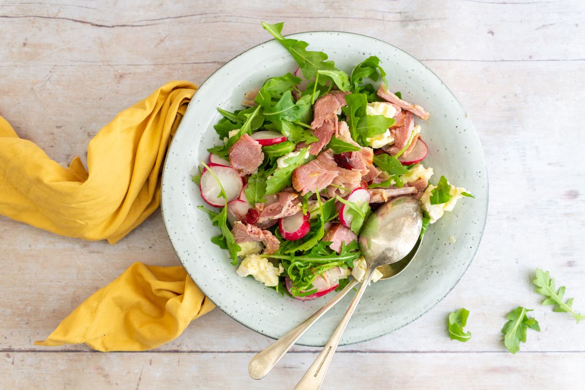 Roughly tear/shred the cooked ham. Roughly crumble the Camembert. Add the cooked ham and cheese crumbles to the salad. Toss to combine.Step 4