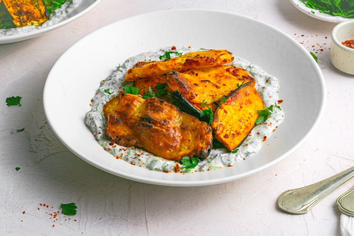 To assemble, divide the herbed yogurt onto 2 plates. Top with the roasted eggplant and halloumi. Garnish with fresh herbs and chili flakes, and serve!