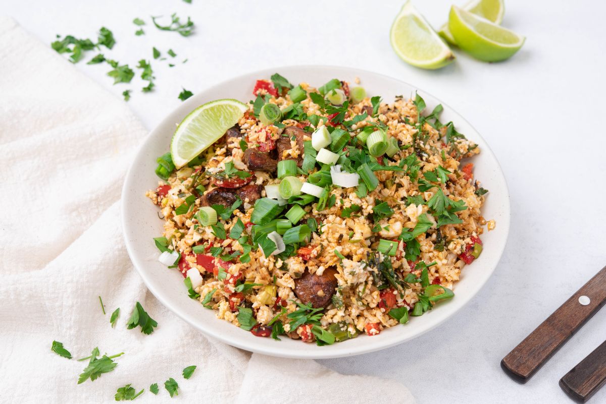 Serve the meat with cauliflower rice. Taste and optionally season with some more salt or pepper. Garnish with some freshly chopped spring onions and lime wedges. Serve immediately.